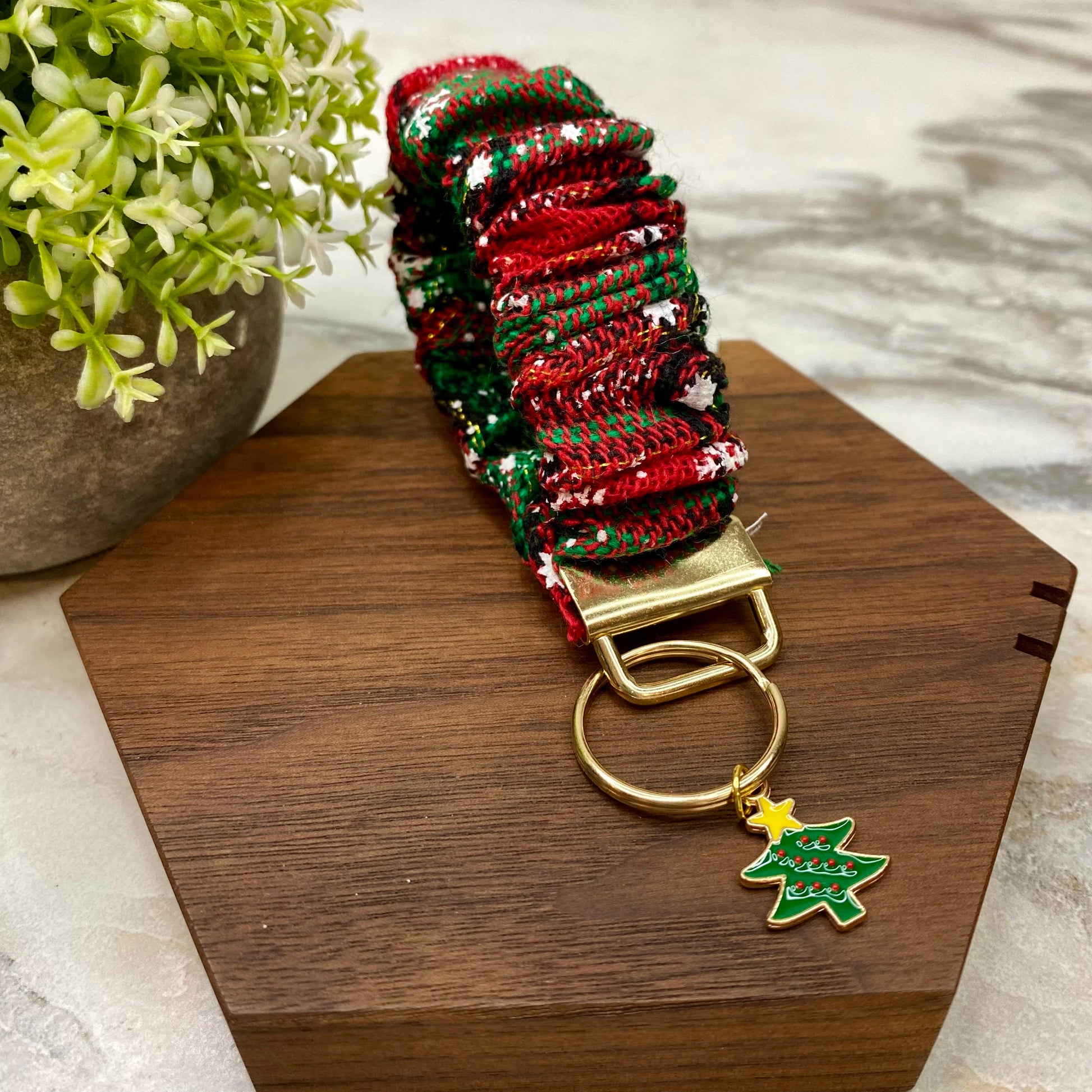Scrunchie Bracelet Keychain - Christmas - Red Green Tree