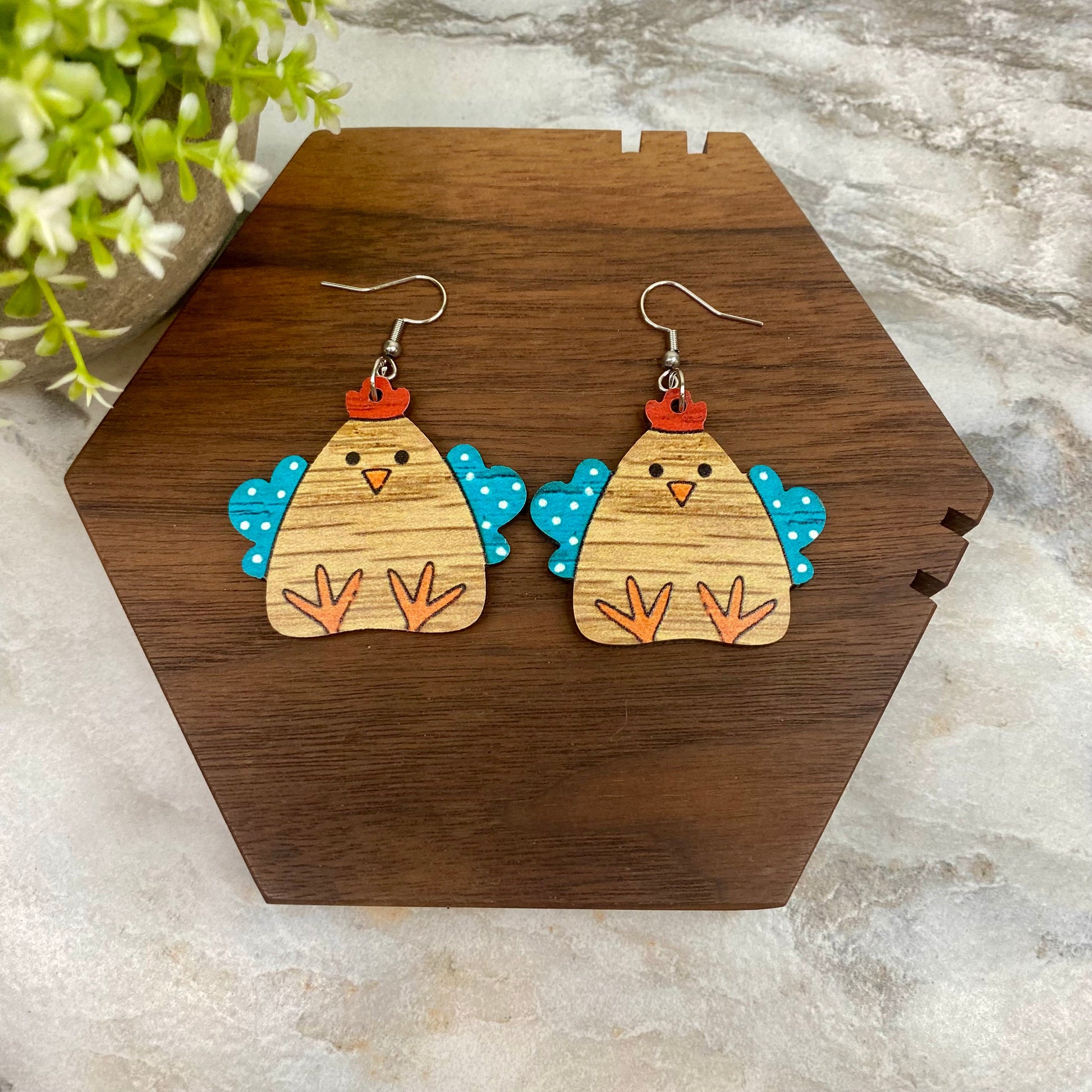 Wooden Dangle Earrings - Chicken - #8